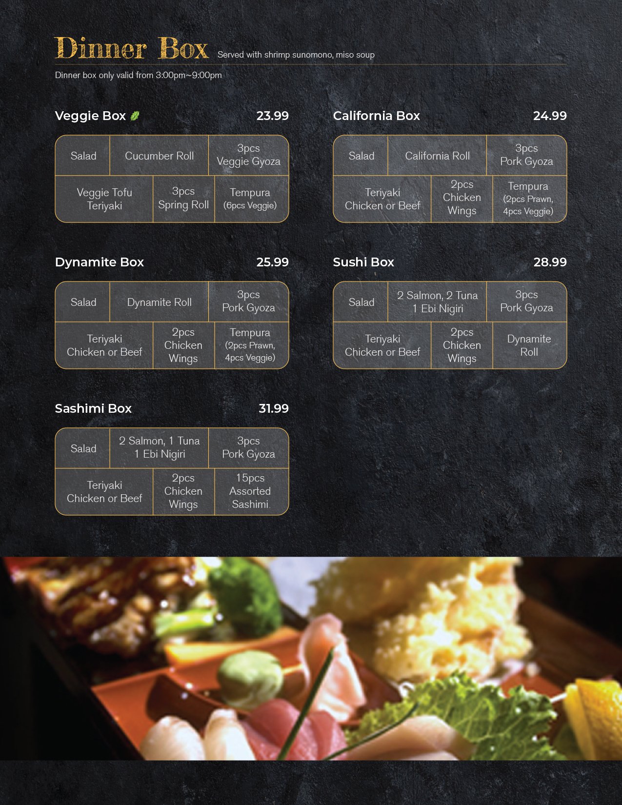 We are striving to become one of your favorite Japanese dining experiences in Chilliwack. We are committed to providing our guests with unique menu creations that are true to the Japanese culture, outstanding service & hospitality, and a comfortable, contemporary atomsphere... All at reasonable prices. We trust that we will continue to be a dining experience that you will want to share with your friends & family over and over again. Visit Us Today! We are also forever looking for new ways to improve on ourselves, making your dining experience more rewarding with each successive visit.